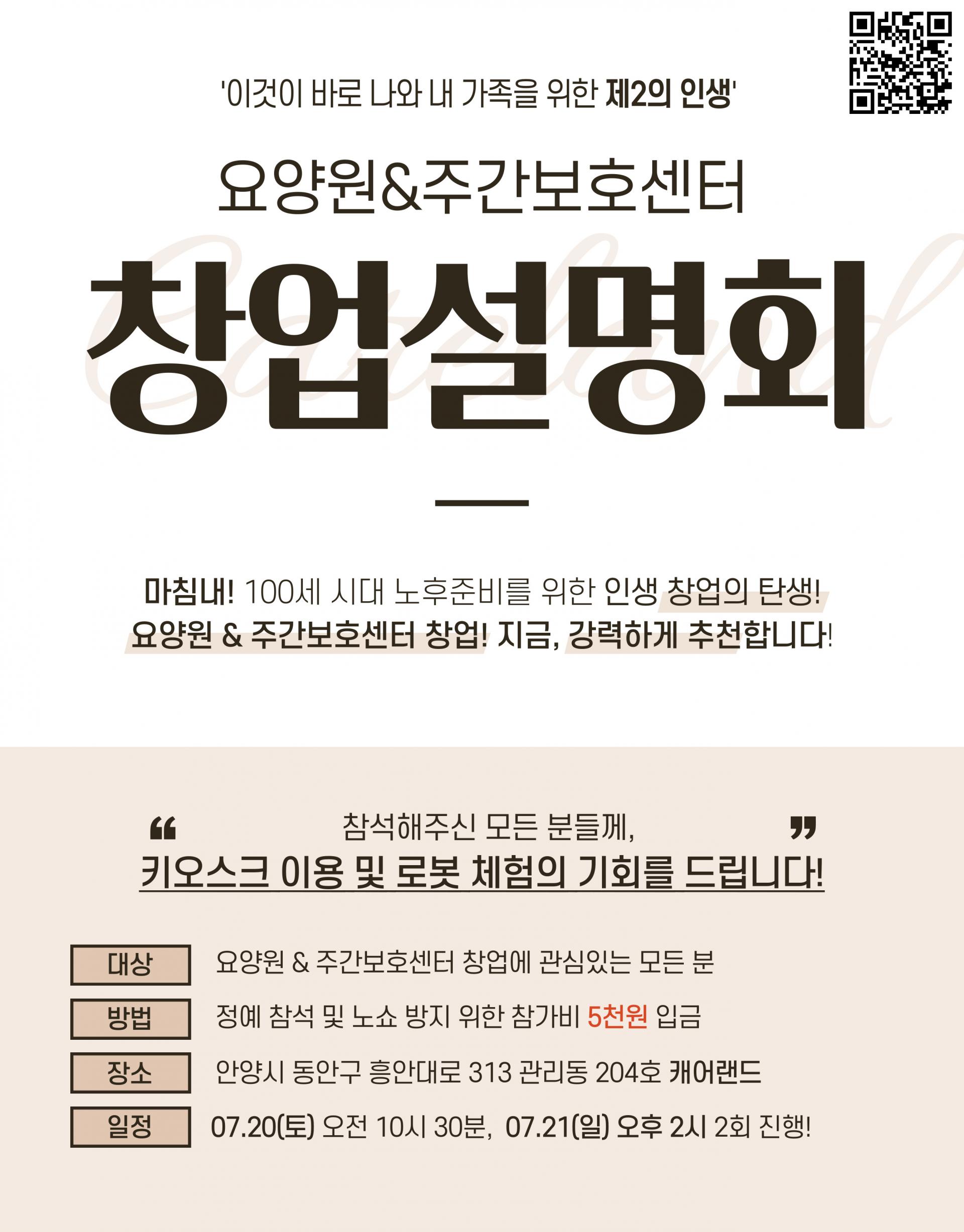 신청방법QR 또는 아래 링크로 연결↓↓↓↓↓↓↓↓↓요양원&주간보호센터 창업설명회 신청 바로가기문의